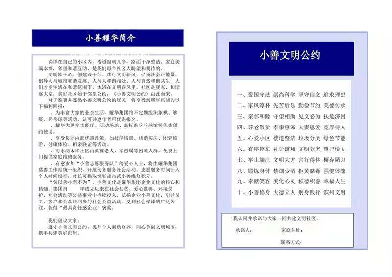《小善文明公約》得到了大家的一致好評(píng),參與的居民都在《小善文明公約》承諾書上簽署自己的名字,并紛紛表示耀華集團(tuán)是一個(gè)有愛(ài)心、有責(zé)任感的企業(yè),承諾會(huì)自覺(jué)遵守相關(guān)條款,從身邊小善做起,爭(zhēng)做創(chuàng)建文明小區(qū)的先行者。
